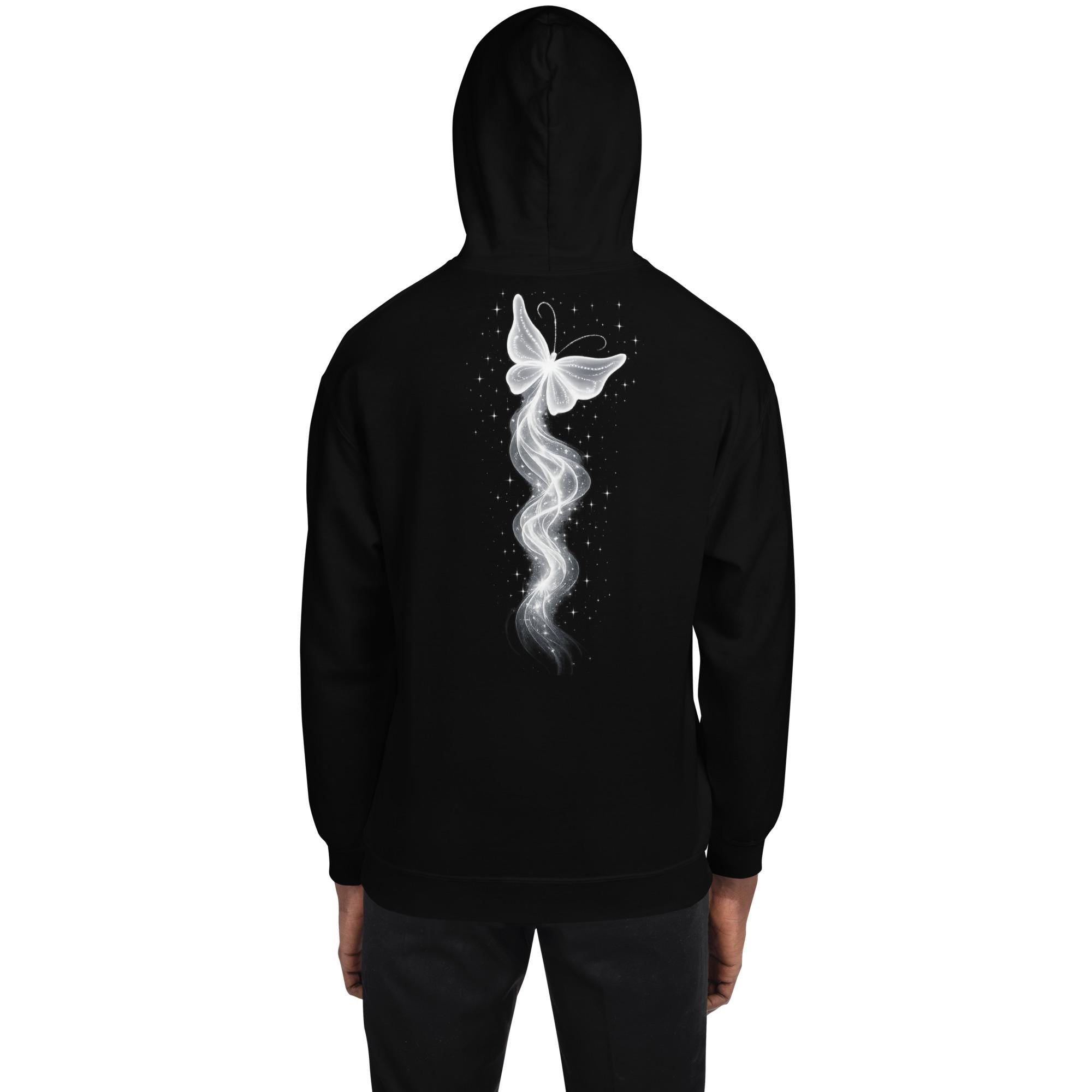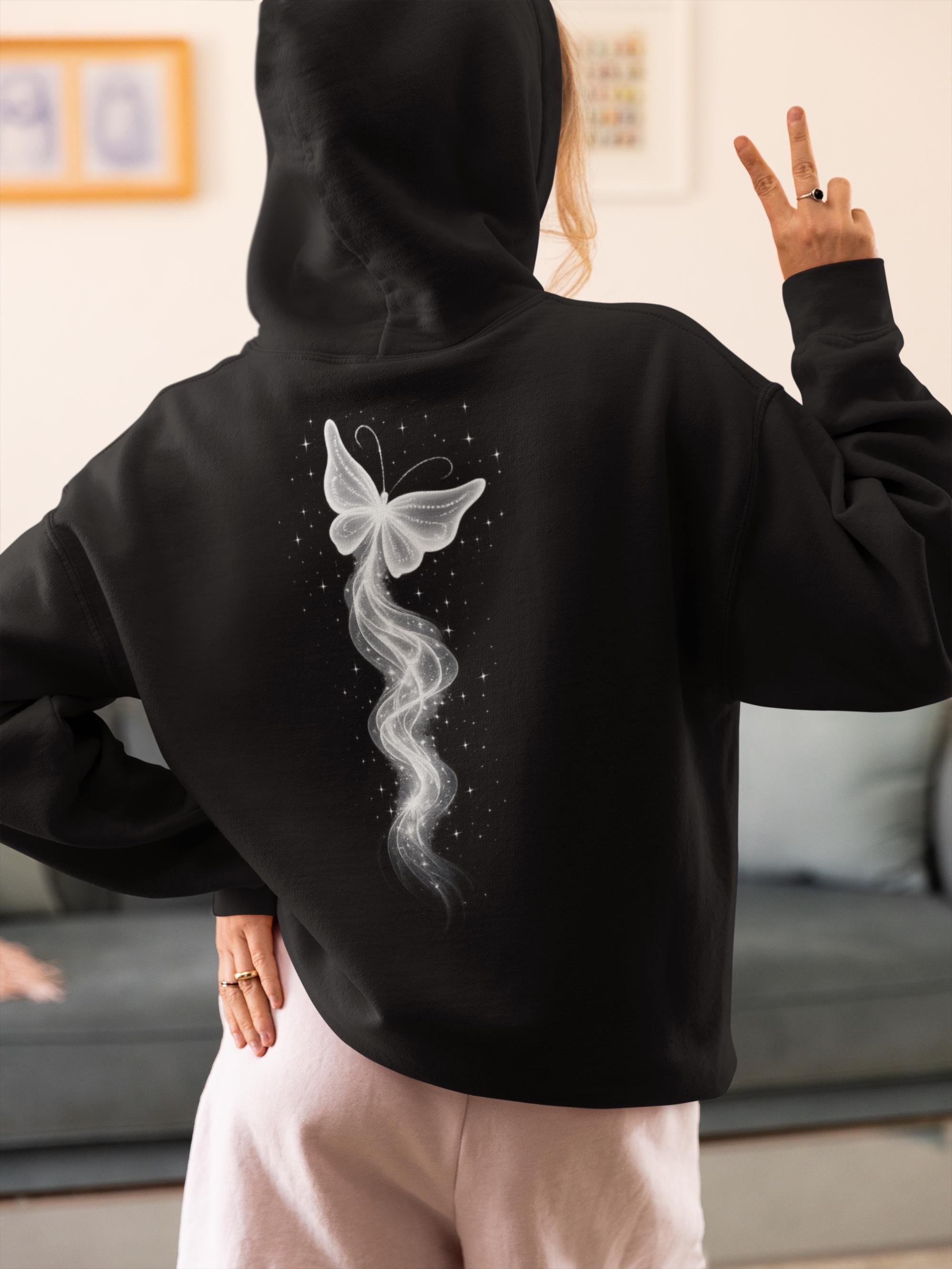 This ethereal butterfly hoodie features a delicate white butterfly with flowing, smoke-like details printed on the back. Designed with a minimalist and spiritual aesthetic, it brings a soft yet powerful presence to your everyday style.